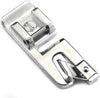Feed your fabric through the small funnel located on the front of the foot. The funnel turns the fabric under while the needle stitches it down to create a perfect narrow hem.