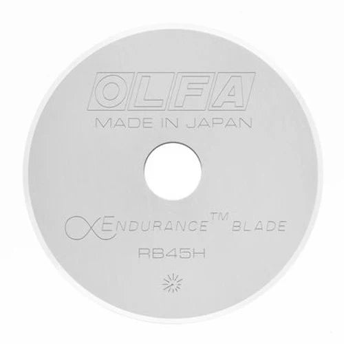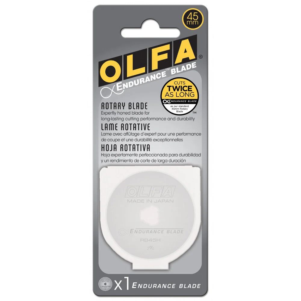 Olfa's 45mm Endurance Rotary Blade will cut twice as long as a standard rotary cutter blade. This high-performance blade fits all Olfa 45mm rotary cutter handles! Change out your blade today and experience the effortlessness and precision of Olfa's 45mm Endurance Rotary Blade.