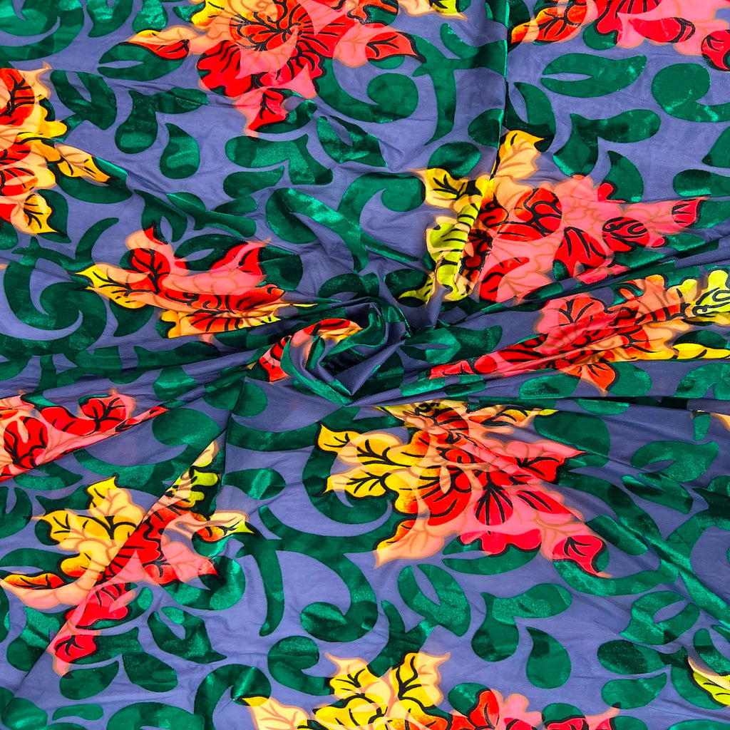 This luxurious multicolor floral burnout stretch velvet fabric is sold by the yard, allowing you to create stunning pieces tailored to your needs. If more than one yard is ordered, the fabric will come in one continuous piece. For example, ordering one yard provides a piece measuring 58" x 36", while two yards will yield a generous 58" x 72".