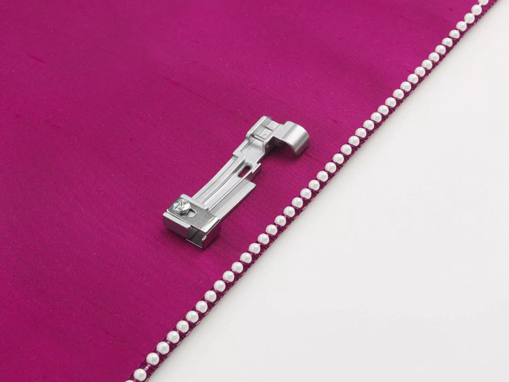 The Beading foot smoothly guides beads and pearls through a channel on the foot for the easy application on garments or crafts.