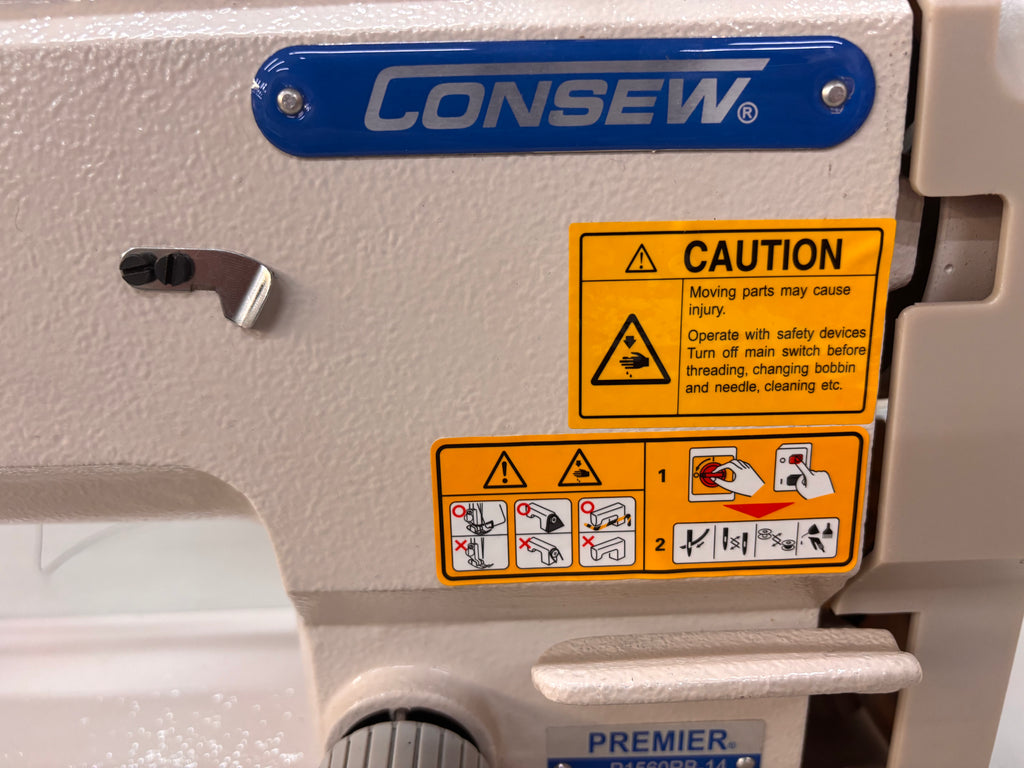 The Consew P1650 RB‑14 is a powerful, heavy‑duty lockstitch sewing machine tailored for thick and multi-layered materials. It combines a large presser foot clearance, advanced compound feed system, and direct-drive servo motor, offering up to 9 mm stitch length at speeds around 2,500 SPM. With features like split-needle capability, automatic thread trimming, and reverse stitching, it’s optimized for upholstery, marine canvas, and other industrial textile applications.